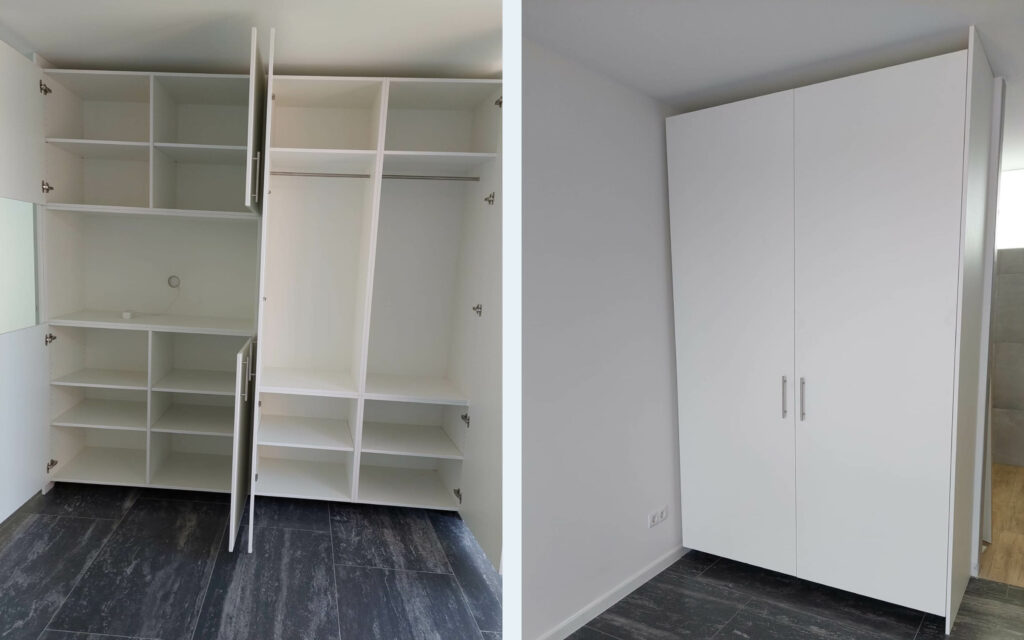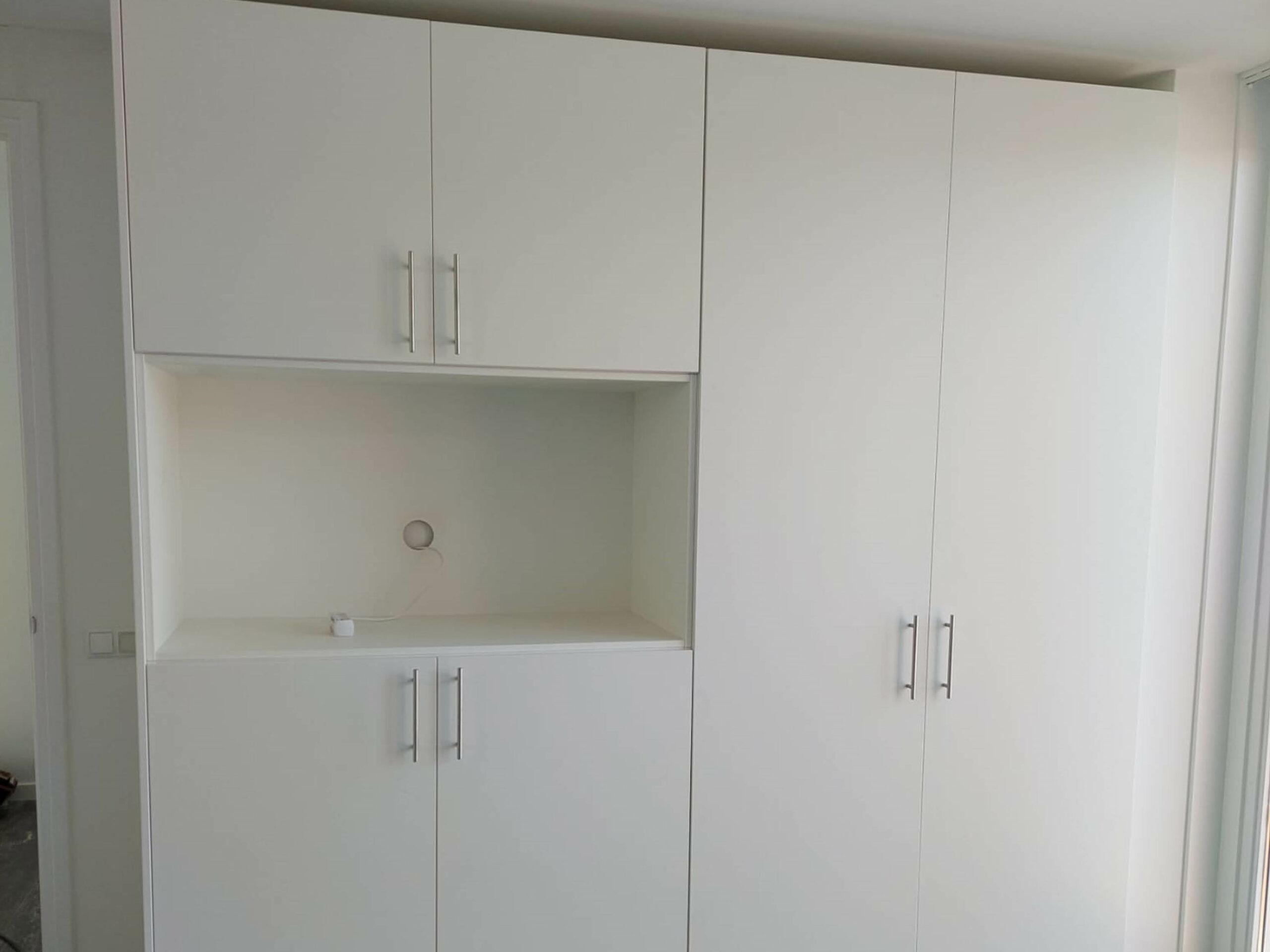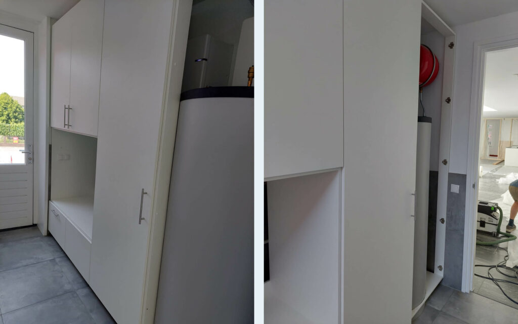 Voor dit project heb ik samen met de opdrachtgever gekeken naar wat een perfecte indeling is voor hetgeen zij kwijt willen in de kasten en de ruimte die ervoor beschikbaar is. Alles is gemaakt in de witte W10410SD platen en in de bijkeuken zijn deze uiteraard vochtwerend. De wasmachine, droger, televisie, kleding en de overige spulletjes hebben mijn inziens een mooi plekje gekregen.