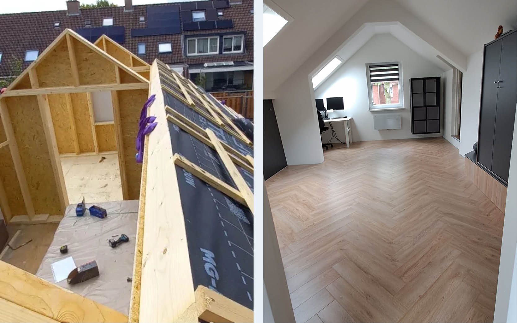 Je hebt een vrij kleine zolder boven je garage maar eigenlijk de behoefte aan een extra slaapkamer en werkkamer. Dat is wat er bij deze opdrachtgever speelde. We hebben dan ook het oude dak weggebroken van de garage en een nieuwe vloer gemaakt. Hierop hebben we compleet geprefabriceerde houtskelet elementen geplaatst. Het geheel is voor en achter afgewerkt met onderhoudsarme gevelbekleding en op het dak zijn de oude dakpannen teruggelegd. Deze opbouw is uiteindelijk een fijne slaapkamer geworden met een mooie werkplek.